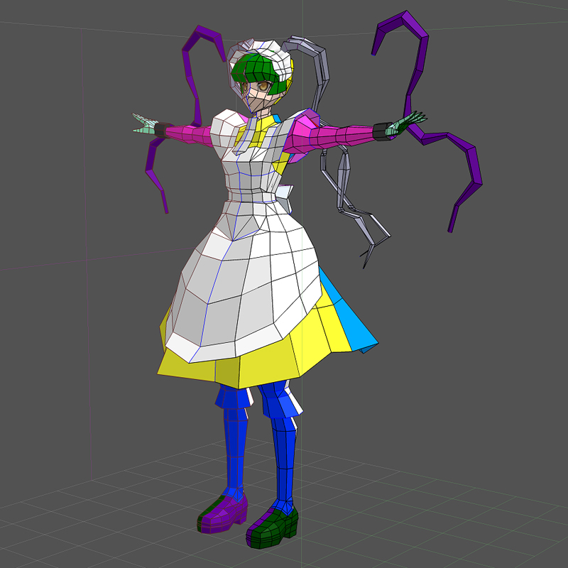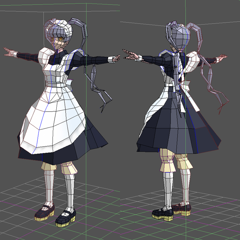 正直なところエプロンもメイドワンピに描いてしまいたいのですが、それじゃあまりにも夢がないかなあ、と思って別パーツで。しかも何コレ?っつーぐらい顔ポリ少なめ(あやまれ!全国の六角キャラモデラーさん達にあやまれ!)。二次絵のキャラ顔を立体化すること自体レベル高すぎだと思うんで、もう初めからディティール作らない方向で。