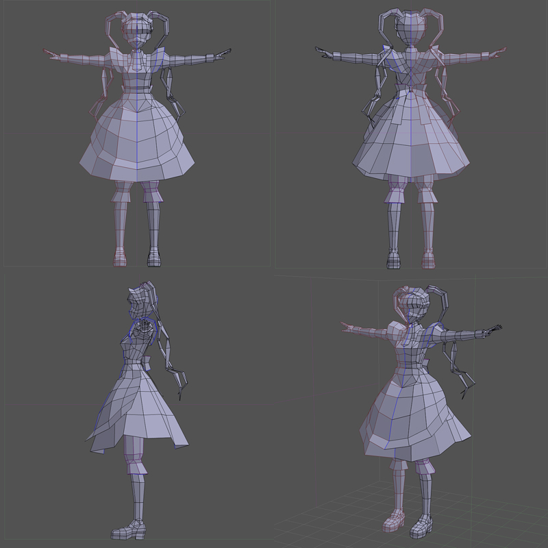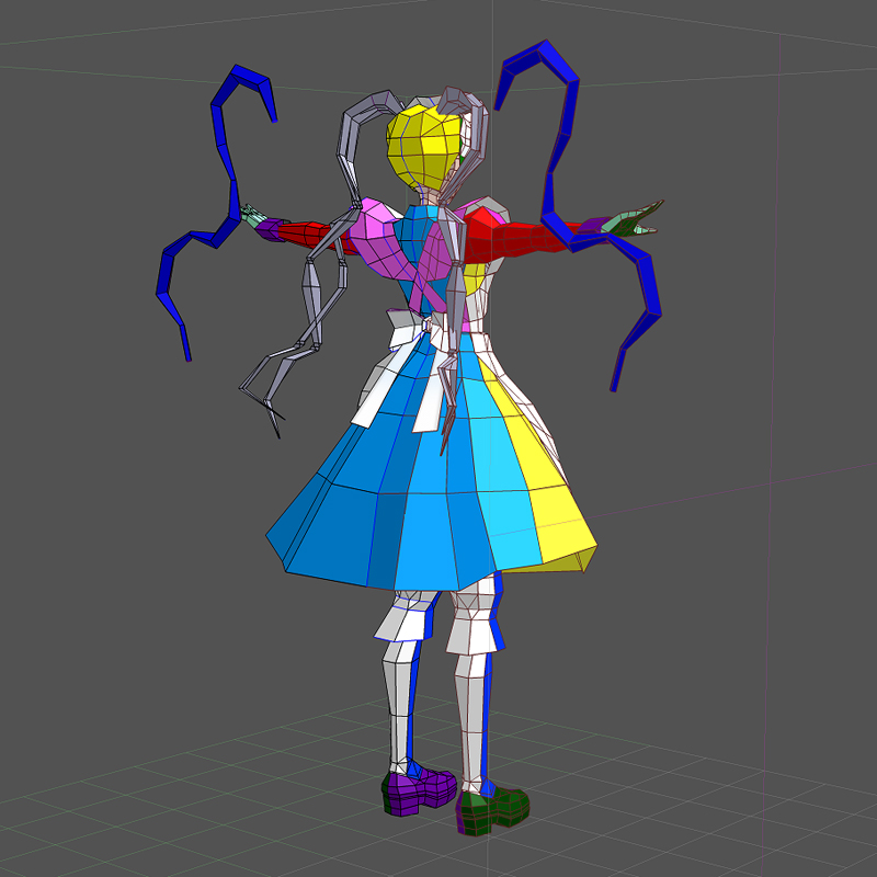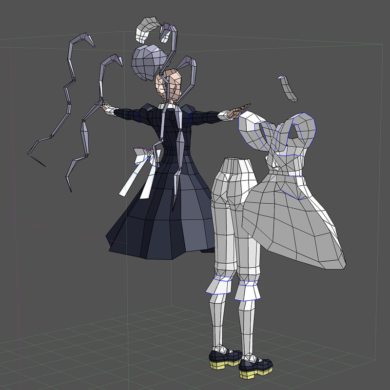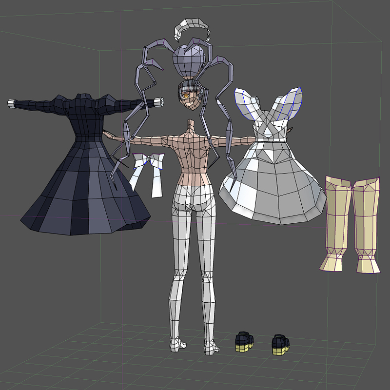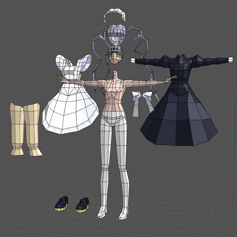 見えないところは作らない人なんですが、それじゃあまりにも夢がないかなあ、と思ってドロワとか少し作ってみる。裸ボディは全部削って顔から指先とスカートまでを1スキン、ドロワのおなかから靴の先までを1スキンでまとめる。