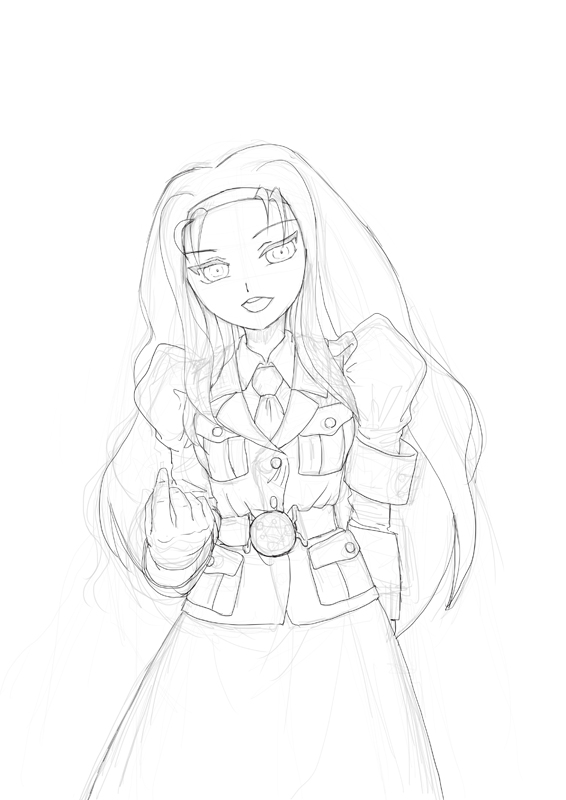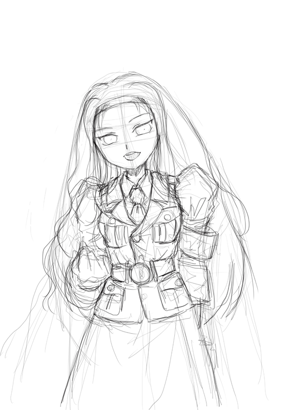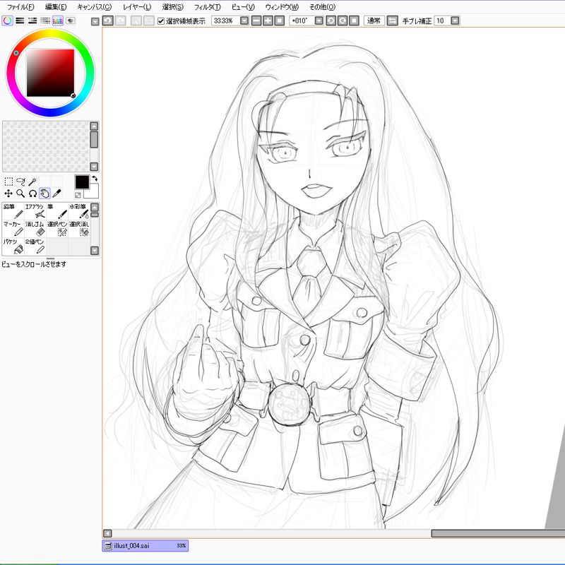 開始40分。参考本の女の子は学生なんですが、同じにしてもアレなので、ポーズは同じ感じで適当に服とか変えて見る。描いてて服のボタンが右前なのに気付いたけどまあ、練習なのでどうでもよか。習作ってやつですか。下書きの上にレイヤー追加してさらにぐりぐり描いていきます。遊びが多く決まらない線があるけど大丈夫なんでしょうか?